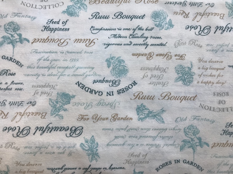 Verschiedene Schriftzüge und Rosen in taube und mint auf weissem Grund, 110cm breit, Druckstoff,[nbspBio-]Baumwolle
